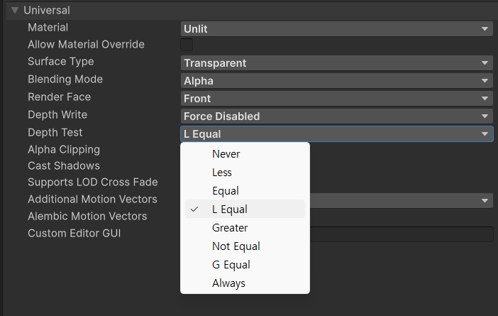 Depth Write는 Force Enabled 로 설정하여 강제로 Z버퍼에 쓰게 만들어 준다.
