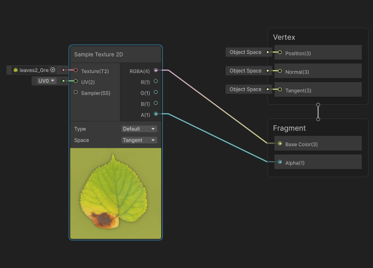 Unlit 셰이더에서 그래프 설정의 SurfaceType을 Transparent로 바꾸고 텍스쳐의 Color와 알파 채널을 연결해준다.