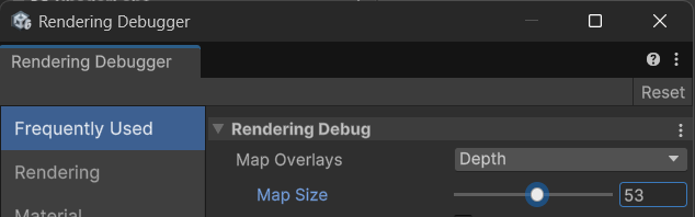 Rendering Debug 메뉴에서 Map Overlay를 Depth로 바꿔 준다. Map Size로 화면에 보이는 Depth창의 크기를 바꿀 수 있다.
